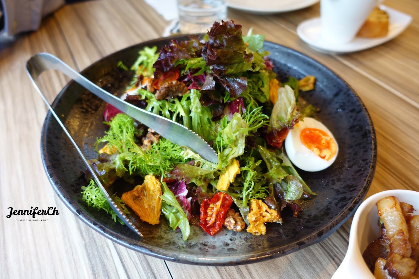 配色非常漂亮,半熟水煮蛋只有一顆,但另外有胡桃、風乾番茄、鳳梨乾等等,食材很不賴。