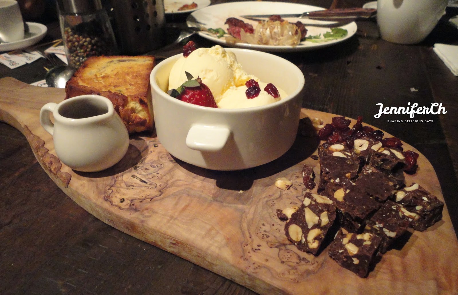從左邊過來是烤香蕉蛋糕、巧克力醬、香草冰淇淋佐草莓、蔓越莓乾,跟剛剛提到的超好吃的杏仁巧克力~~~